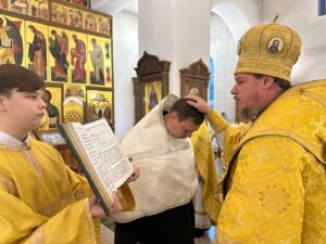 Перед началом Божественной литургии было совершено чинопоследование поставления во чтеца Захарчука Дмитрия, выпускника очного отделения Томской духовной семинарии 2022 года, пономаря Преображенского храма рп. Белый Яр Верхнекетского района.